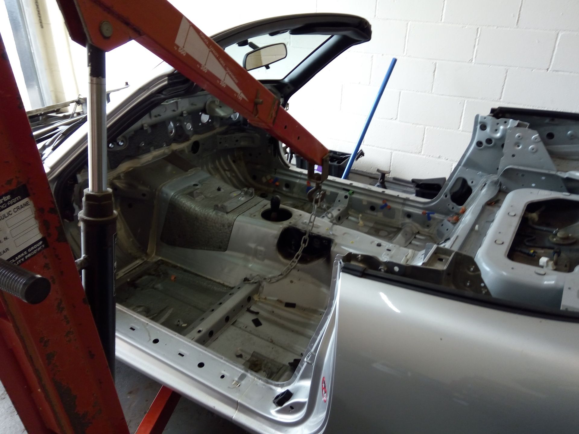 An engine hoist was then manoeuvred into position from the side so that its hook hung above the transmission tunnel and a lifting chain attached across the transmission tunnel as described in the build guide.